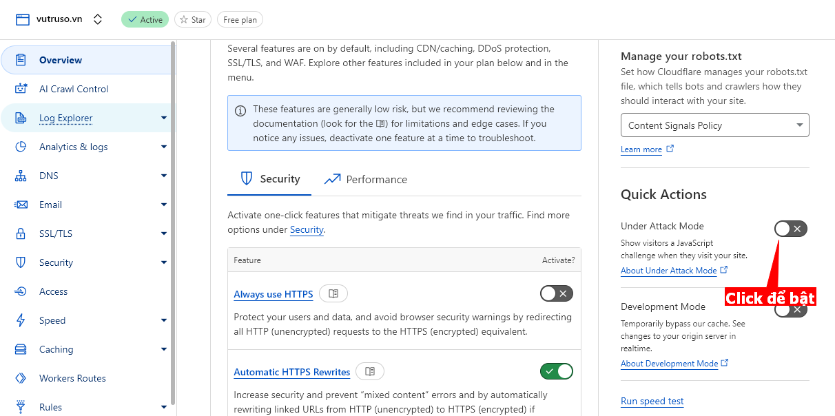 Bước 3: Bạn sẽ thấy ngay chức năng Under Attack Mode ngay dưới mục Quick Actions bên tay phải, chỉ cần click vào để bật Under Attack Cloudflare lên
