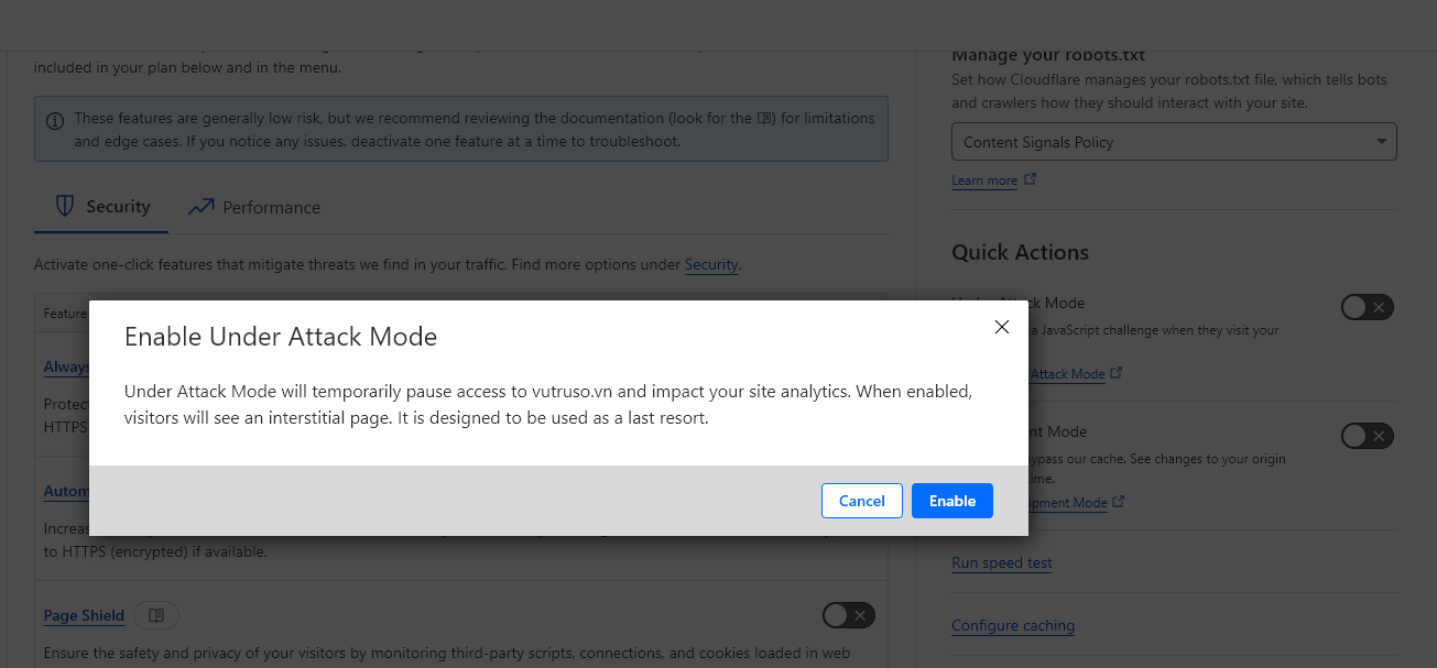 Under Attack Mode là công cụ hữu ích để bảo vệ website trong tình huống khẩn cấp. Tuy nhiên, hãy sử dụng một cách có chọn lọc để đảm bảo trải nghiệm tốt nhất cho người dùng hợp lệ.