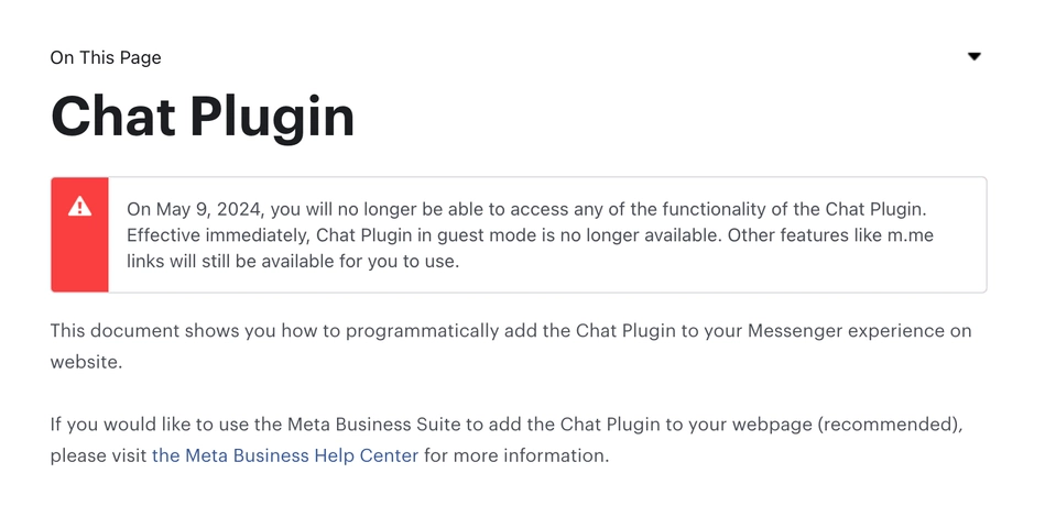 Tuy nhiên, từ ngày 9/5/2024, Meta đã chính thức ngừng hỗ trợ Chat Plugin trên tất cả website. Điều này đồng nghĩa với việc cửa sổ chat Messenger nhúng trực tiếp không còn hoạt động.