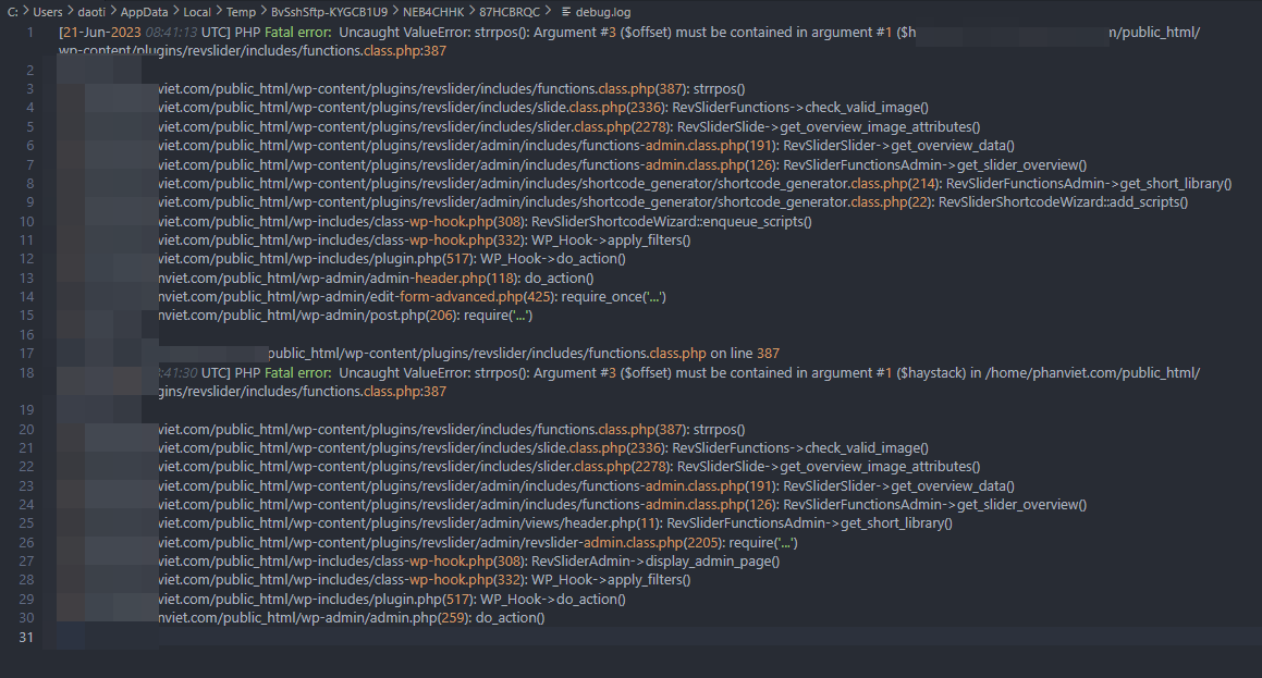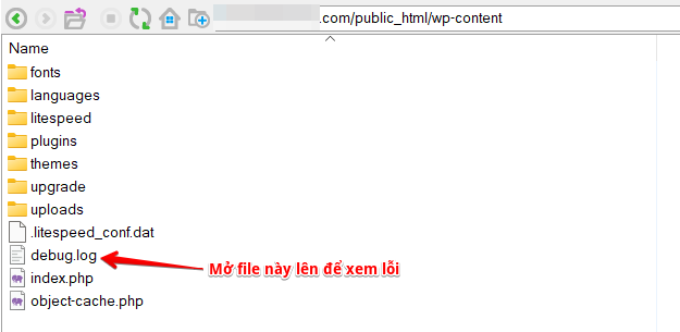 Có thể có 1 số lúc lỗi sẽ không hiện trực tiếp trên trình duyệt như ảnh bên trên nên bạn có thể vào đường dẫn: website.com/public_html/wp-content/