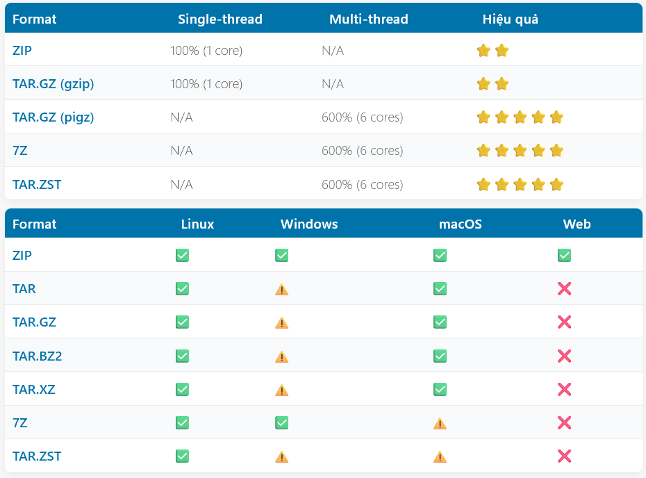 | Format | Giải nén (1 thread) | Giải nén (6 threads) | Tốc độ |