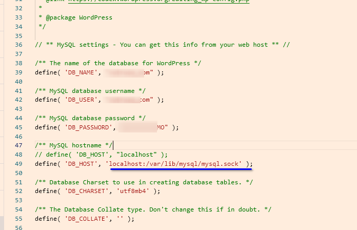 | Thay trong wp-config.php | define( 'DB_HOST', 'localhost:/run/mysqld/mysqld.sock' ); |