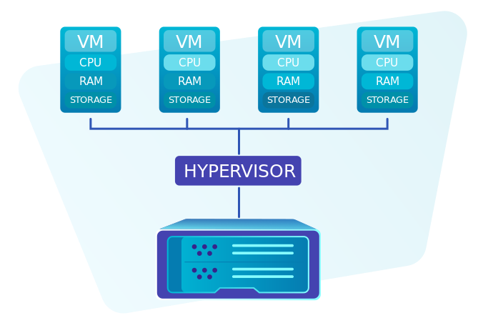 Hypervisor (phần mềm quản lý các VMs) không thể “nhân đôi” CPU vật lý. Thay vào đó, nó dùng kỹ thuật time-slicing—chia nhỏ thời gian CPU thành các khung hình (time slice) và phân phối cho từng VM theo lượt.
